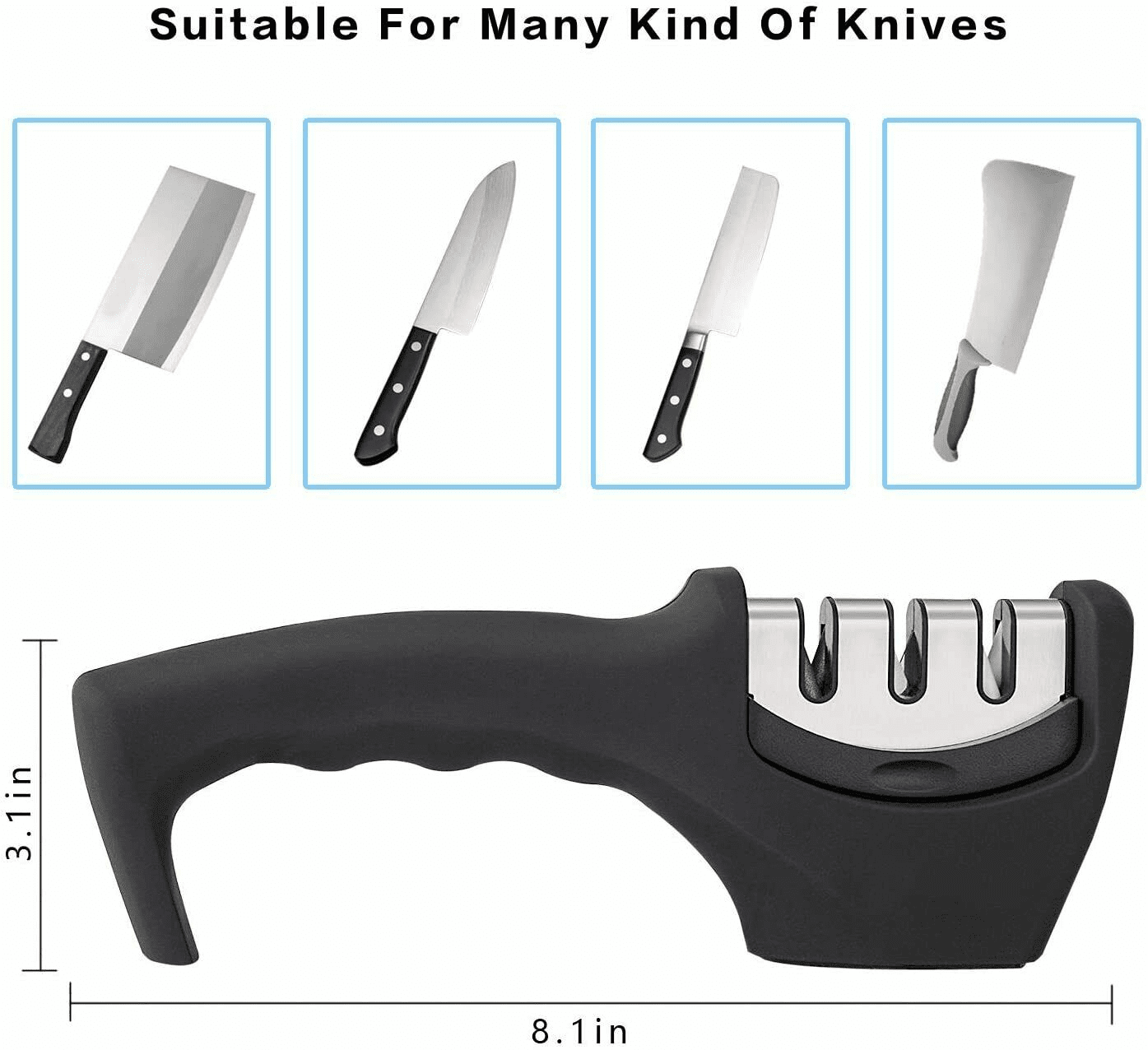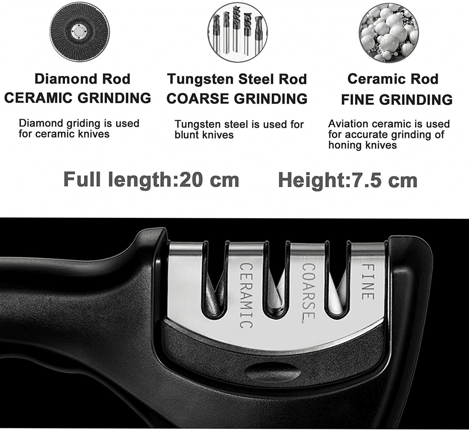 Professional Knife Sharpener by KT DealsFeatures The 3-Step Knife Sharpening kits are designed to sharpen any dull or damaged knives and blades. Stage 1: diamond sharpening rod repairs and straightens damaged blades. Stage 2: slot sharpens to restore its V-shape. stage 3 slot fine tunes for a final best polish. How Our Knife Sharpener Works: Stage 1 - Preparation (High grade Diamond rods). This 'roughens' the knife edge to prepare the surface for sharpening. It also smoothes any nicks and imperfections that could cause the blade to 'catch' during the sharpening stage (a common problem with 1 and 2 stage pull through sharpening slots which can cause damage to blades). Stage 2 - Sharpening (Hardened Tungsten Carbide Plates) - Now pull the blade through slot 2's precision angled tungsten carbide plates to create the perfect sharpened 'V' edge on even the bluntest knife. Stage 3 - Hone (Ceramic Stone Rods) - For final edge honing. It removes any burs and gently polishes the blade edges for a super sharp polish.