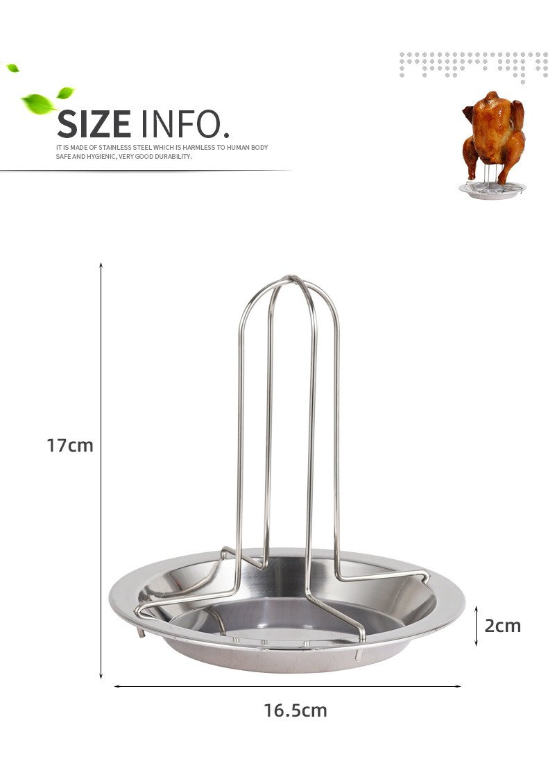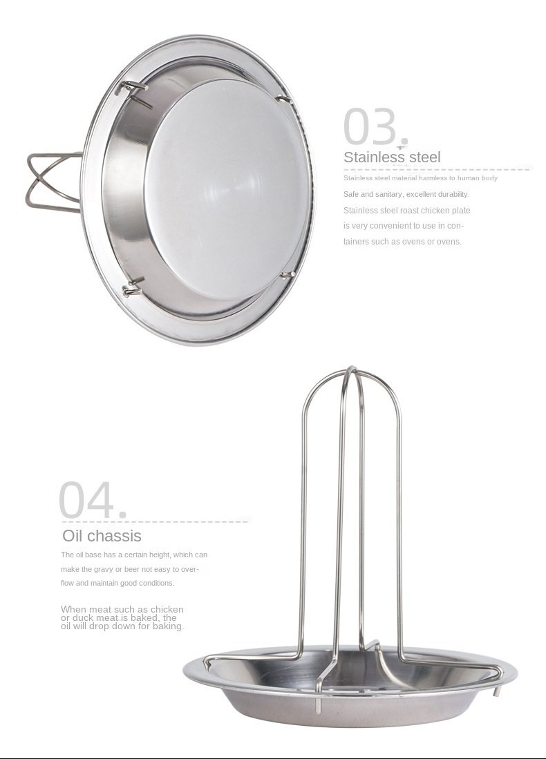 Roast chicken tray is used for roasting and supporting the roast chicken in the oven, and the chassis is used to put the auxiliary materials and to smoke the flavor effect inside the chicken in order to achieve better taste. This product is processed by stretching, stamping, surface photometric treatment and other technologies, then after strict inspection, on the packaging, exported to many countries, very high cost performance, quality assurance.