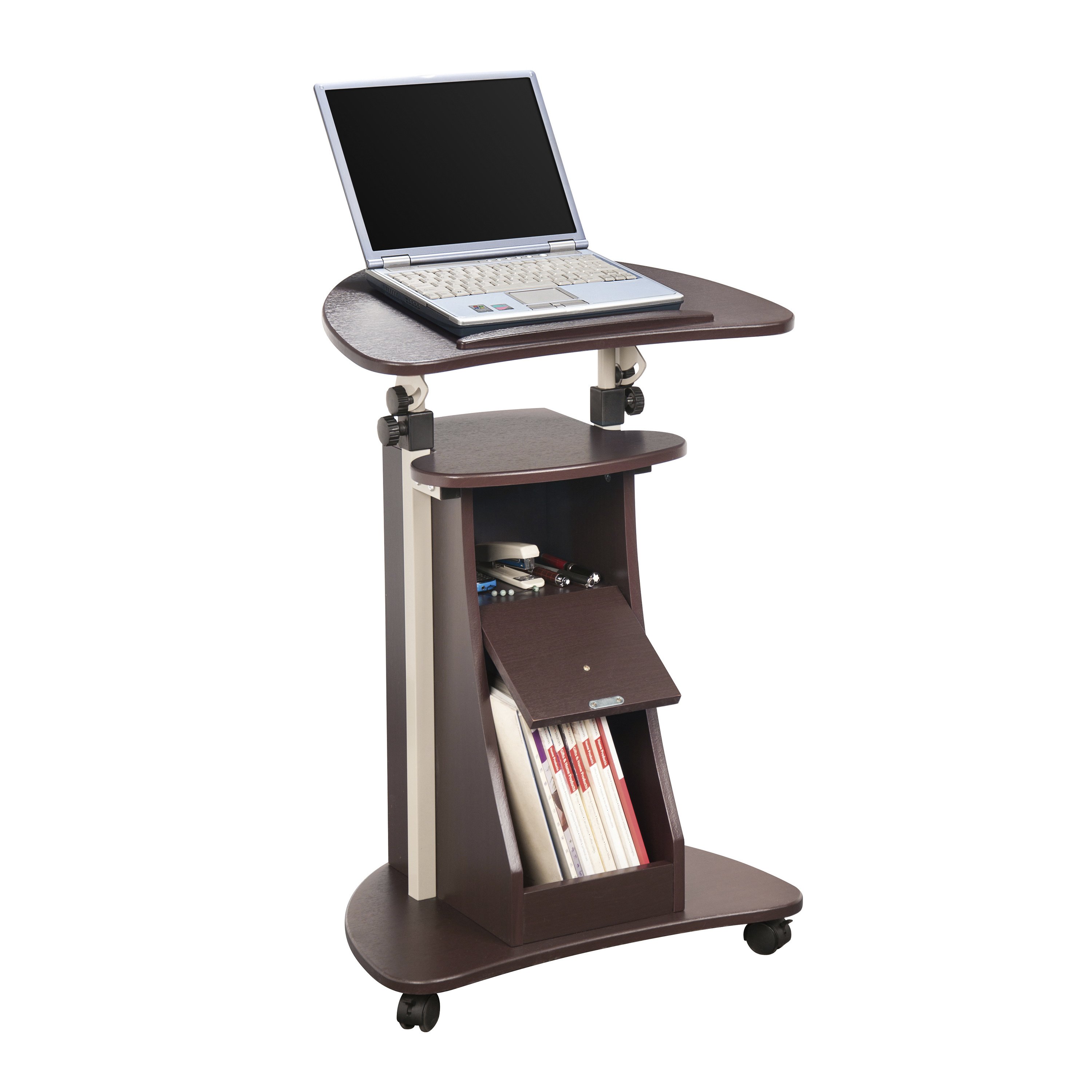 Techni Mobili Sit-to-Stand Rolling Adjustable Laptop Cart With Storage, ChocolateThe Techni Mobili Deluxe Sit-to-Stand Rolling Laptop Cart with Storage saves space while providing the laptop or writing setup you need. The table panel tilts so you can adjust it to the most ergonomic, comfortable working angle. It also features a safety edge-stopper to prevent objects from sliding off when tilted. You can easily adjust the table height between 31.5 and 45.5 inches with dual adjustment knobs. There is an open storage compartment and a closed storage compartment with bottom hinges. Two of the fours non-marking nylon casters include locking mechanisms. The table and closed storage top and bottom shelves each have a 20 lbs. weight capacity and the base of the cart has a 30 lbs. weight capacity and is made of MDF panels with a moisture laminate veneer atop scratch-resistant powder-coated steel frame . Color: Chocolate.